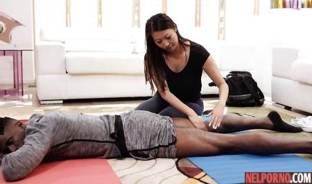 Вот все привыкли, что если жесткое межрасовое порно, то там негр с просто таки громадным половым прибором страстно жарит грудастую белую матрону или наоборот. Но вот здесь азиатская специалистка по йоге Шэрон Ли приходит к черному парню, чтобы научить его уму-разуму, но по факту гоняет мужскую шнягу между просто таки громадных буферов, плавно переходя к межрасовому траху по типу азиаты с неграми.