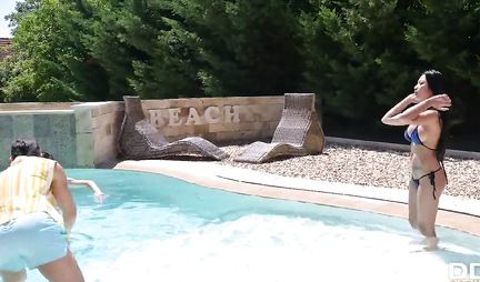 Азиатка с татуировками красиво в бассейне трахается в два члена с крутыми мужчинами