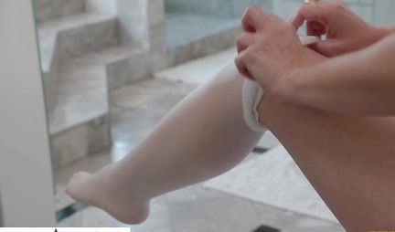 Блондинка мамочка показала другу сына татуировку и раздвигает ноги в чулках для секса