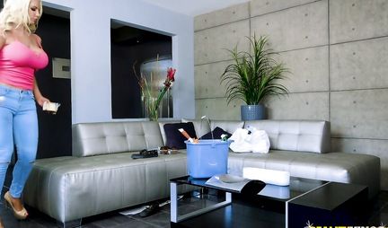 Блондинку с большими дойками отымел стоя в ванной друг брата