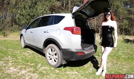 Бородатый и толстый мужик в солнечных очках заставил подругу в маске сосать член на природе