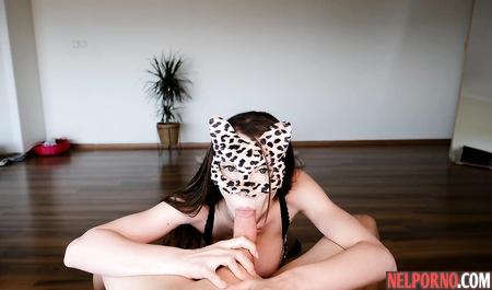 Брюнетка с большими дойками и в маске снимается в домашнем порно от первого лица
