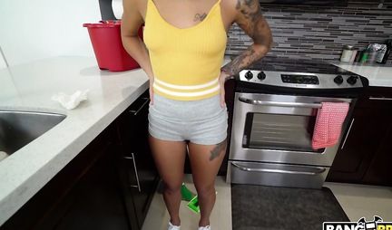 Уговорил показать сиськи колумбийку за деньги на 04:30; полностью сняла с себя остатки одежды на 06:10; начинаю дрочить на девчонку на 18:06; соглашается соснуть мой член за бонус к прошлым деньгам на 19:23; садится на меня своей колумбийской попой сверху на 24:43; а вот я уже дрючу её в догги-стайл на грязном полу на 27:42; и снова колумбийка на моем члене сверху на 34:07; и тут мы вспомнили про миссионерскую позицию на 40:20; пришло время кончать на лицо и заканчивать безобразие с уборщицей на 43:22; на этом все.