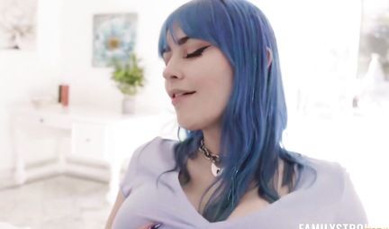 Синеволосая Джевелс Блю весьма востребована у мужского пола, а все потому что девушка постоянно отрабатывает навыки соблазнения на своем сводном брате, с которым и живет. Вот и сегодня она просит товарища приготовить реферат, делая за это умелый минет. Вот только дело чуть не заканчивается разоблачением перед мачехой, так что молодым приходится шифроваться. Ну так даже и лучше!...
