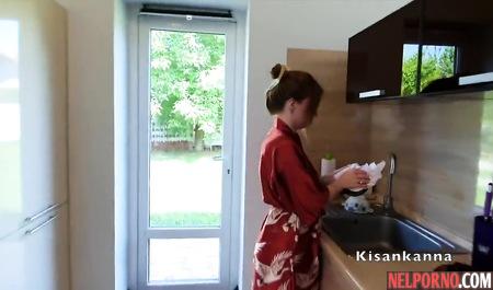 Домохозяйка красиво делает русскому бизнесмену горловой минет на кухне