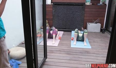 Две молоденькие студентки в лосинах согласились на групповой секс втроем