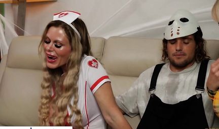 Две грудастые бабенки и раньше то не были образцом мужество и отваги, а в ночь на Хеллоуин вообще готовы обоссаться от любого шороха, потому дико пугаются случайного воришку, забравшегося к ним в дом. Но в итоге оказывается что это их давний и молодой знакомый которому они сосут член и орально ублажают друг друга во время интимной встречи.