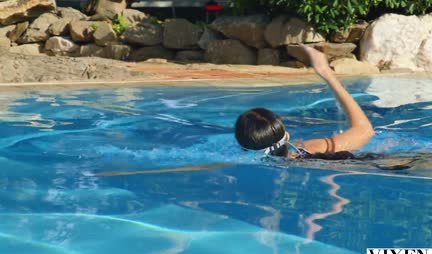 Горячая брюнетка наслаждается большим членом у бассейна