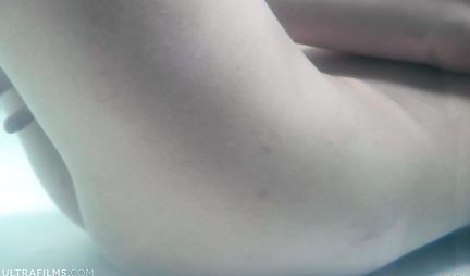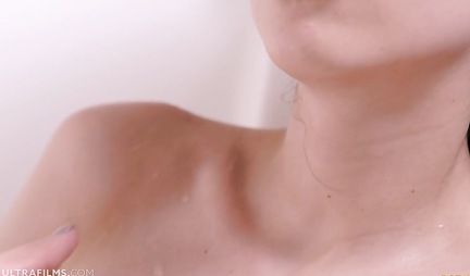Худая телочка с упругими сиськами мастурбирует киску в ванной