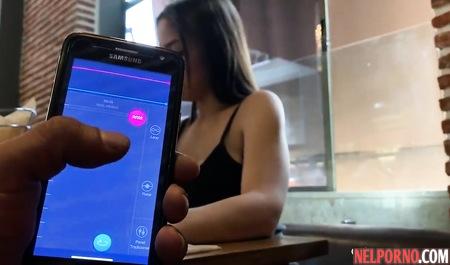 Парень при помощи мобильного приложения доводит девушку до оргазма прямо на публике