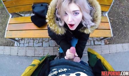 Пикап молодой блондинки на публике завершается глубоким минетом на свежем воздухе