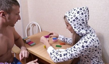 Шататься по московским улицам во время самоизоляции на самом деле стремно потерей нескольких тысяч из семейного бюджета, а потому молодая семейная пара занята архитектурными играми и даже спорами. Проигравшая миловидная дамочка зачетно сосет член мужа и подставляет тому задницу в знак проигрыша. Интересно, а как бы рассчитывался супруг в случае если бы фортуна показала ему задницу? Тоже бы дался в очко?