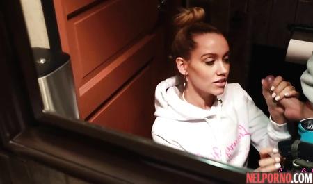 Русская молодая жена порадовала мужа дрочкой и глубоким минетом в туалете кафе