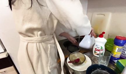 Русская распахнула халат на кухне и насладилась домашним сексом раком