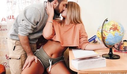 Ну и пусть симпатичная русская девица не знает где находится Канада и Лиссабон. Зато она знает где у преподавателя географии эрогенные зоны. Ну так, когда тот оставляет милашку на дополнительные занятия после уроков, та сосет ему член и находит варианты для секса в разных позах, хотя делать это в условиях школьного кабинета весьма непросто!