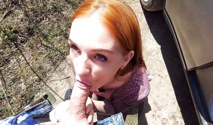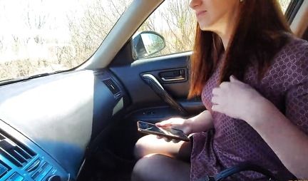 Рыжая красотка в чулках прямо в машине подставляет дырку для русского траха