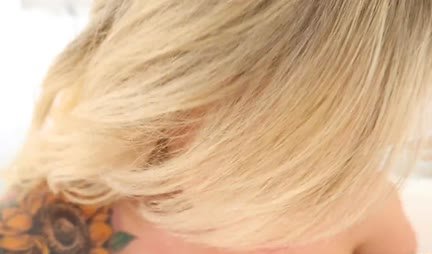Вне всяких сомнений бэйджик в постель этой блондинистой девушке не нужен. Все потому что ее имя и фамилия наколоты на теле. Ну так это даже и лучше, потому что ее друг и товарищ может случайно потерять дар речи от того факта, что осознает какую красавицу потрахивает. Ну а с подсказкой он определенно не допустит подобного конфуза.