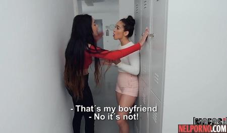Подруга этого молодого человека просто таки писается от злости, упрекая соседку в любовном сношений с другом, но та, полная негодования, зовет чувака в укромное место и там не только сосет конец паренька, но и дрючится с ним в весьма зачетных для этого процесса позах. Похоже эту битву она выиграла и теперь темноволосая красотка на большом члене, а ее противница в реально глубокой жопе.