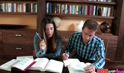 Если молодая студентка на пару со своим другом готовится к предстоящей сессии, то это вовсе не значит что молодая девица забыла о своем романе с преподавательницей, потому что она находит время, чтобы заняться с ней сексом в укромном уголке. Ну а когда за происходящим подглядывает бойфренд, то училка заставляет его принимать участие в групповом порно, а иначе они хрен сдадут экзамены!