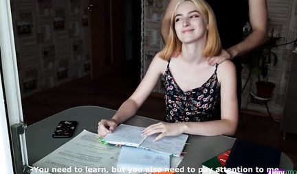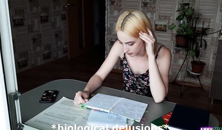 На носу у блондинки экзамен по биологии, поэтому она очень волнуется. Спасибо любимому человеку, который знает как отвлечь красавицу от грустных мыслей. С этой целью он делает девушке массаж и наклоняет ее на столе в позу догги-стайл. Ну так пусть изучает на практике виды и способы полового сношения - так будет польза и удовольствие в одном флаконе.