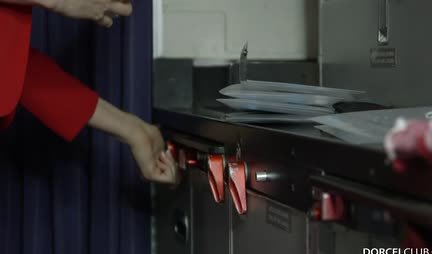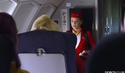 Стюардесса натирает брюнету длинный член в самолете узкой вагиной