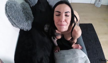Татуированная девушка в нижнем белье открыла ротик для домашнего порно минета