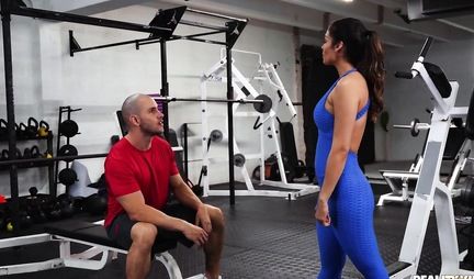 Тренер в зале натягивает на болт тугую и влажную киску девушки в лосинах