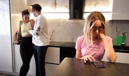 Похоже общения только с мачехой пареньку не хватает от слова абсолютно, а потому он приводит домой симпатичную соседку, забив болт на то факт, что неродная мамашка шарахается неподалеку в телефоне. По видимому с местоимением у парочки реальные проблемы, потому что они запросто трахаются за спиной милфы, ничуть не переживая по этому поводу. Ну а та не будь дурой шликает киску и вполне себе балдеет по своему.