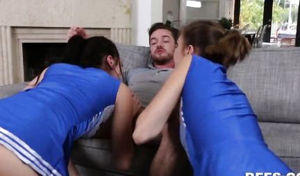 Тренер студенческой команды черлидерш слегка приболел и не пришел на тренировку, но девушки, переживая за здоровье любимого мужчины сами приходят к нему и чтобы поставить того на ноги, сначала поднимают член с помощью группового минета. В итоге тот приходит в себя и жарит сладких студенток в групповухе у себя дома. Вот повезло - так повезло!!!