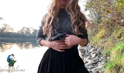 Жопастая красотка задрала короткую юбку и показала парню сиськи на природе